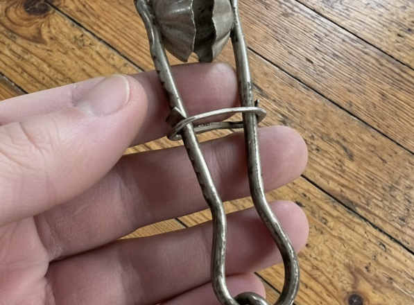 Jednak to kompaktowe, sprężynowe urządzenie to w rzeczywistości zabytkowy zacisk do ręczników kuchennych – praktyczne narzędzie domowe z początku XX wieku.